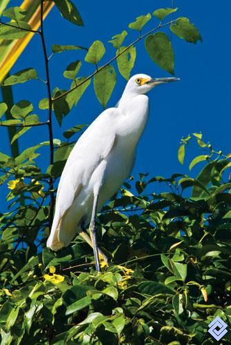 La garcita blanca, Egretta thula, permanece al acecho en la vegetaci?n que bordea los canales y las lagunas estuarinas.