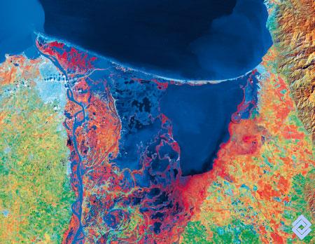 Imagen de sat?lite del plano deltaico del r?o Magdalena con el complejo laguno?estuarino de la Ci?naga Grande de Santa Marta; el color rojo oscuro corresponde a ?reas cubiertas por manglares.