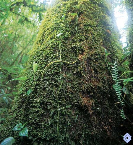 Las epífitas como los musgos y los helechos, entre otras especies, cubren los troncos de los árboles y por su capacidad de regulación hídrica contribuyen al balance del ecosistema.