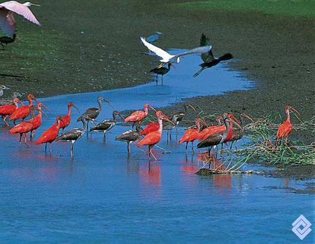 Las corocoras rojas y los ibis negros, entre otras especies, encuentran crustáceos e insectos abundantes en el fango de los esteros; también los acompa?a la garza espátula de pico especializado para filtrar el fango y alimentarse del plancton.
