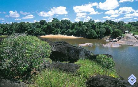 Matorrales y bosque ripario sobre afloramientos del escudo Guayanés en la margen del río Orinoco.