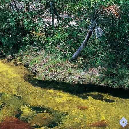 Los caños sobre areniscas cuarcíticas presentan aguas cristalinas y poca profundidad, donde hay peque?os peces que se alimentan de los insectos y frutos que caen del dosel del bosque.
