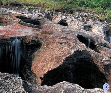 Caño Cristales, el río de los siete colores, ha labrado un profundo cauce en la roca. Durante el verano su caudal se reduce al mínimo