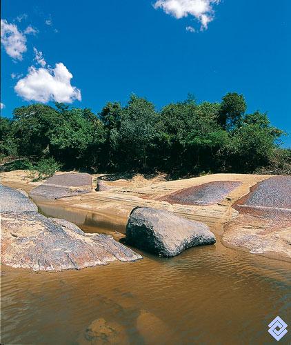 Afloramiento de roca granítica en el cauce del río Orinoco. El bosque de ribera alcanza poco desarrollo sobre este sustrato de suelos arenosos y pobres en nutrientes.
