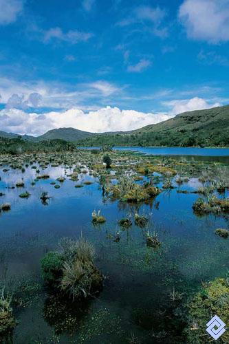 Laguna de origen glaciar en el páramo de Sumapaz. Tras un lento proceso en el que la vegetación ha ido colonizando, se forman peque?os cojines dominados por gramíneas y musgos.