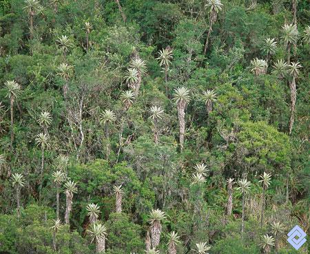 Frailejonal arbustal en el que sobresale Espeletia uribei, endémico de Chingaza; se caracteriza porque alcanza alturas superiores a 10 m en el borde del bosque altoandino.