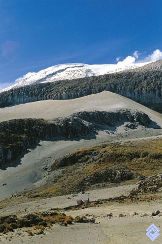 Paisaje del superpáramo, con el volcán Nevado del Ruiz al fondo.