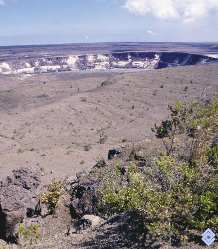 Vegetación abierta con arbustos dispersos sobre los arenales y la roca de origen volcánico, en la alta montaña hawaiana.