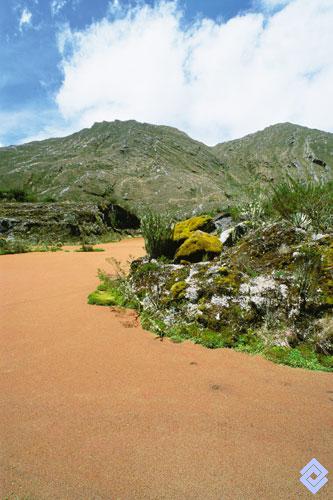 Helecho acuático Azolla filiculoides, que en su estado de madurez adquiere una coloración rojiza y forma una capa flotante y densa sobre la superficie de la laguna. Al terminar su ciclo de vida, aporta su materia orgánica a los sedimentos del fondo.