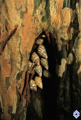 Con el fin de sobrellevar la sequía, algunos caracoles pulmonados se agrupan en las oquedades de los troncos y se aislan del medio produciendo una sustancia que sella sus conchas; otros lo hacen en solitario a la sombra de las plantas del sotobosque que n
