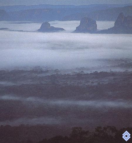 Entre los cinturones de niebla, frecuentes al amanecer y al atardecer, sobresalen los torreones de areníscas.