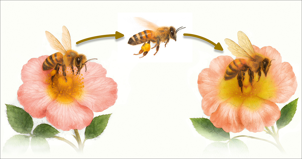 Durante el proceso de polinización por insectos, o entomofilia, el polen es transferido de los órganos masculinos de una flor a los órganos femeninos de otra.