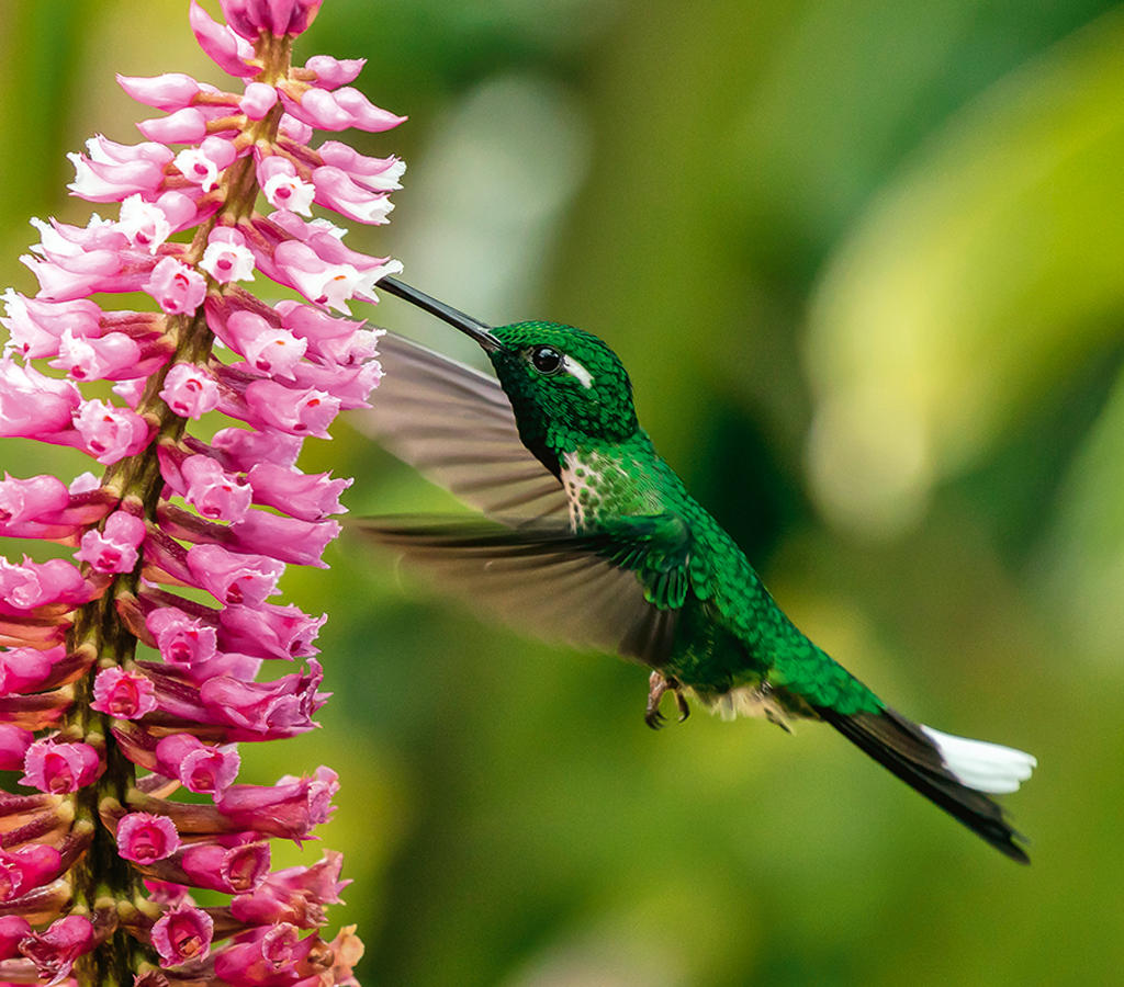 Las flores de ciertas orquídeas producen néctar para recompensar a sus polinizadores. En la foto, una inflorescencia de Elleanthus robustus es visitada por un colibrí puntablanca occidental (Urosticte benjamini).
