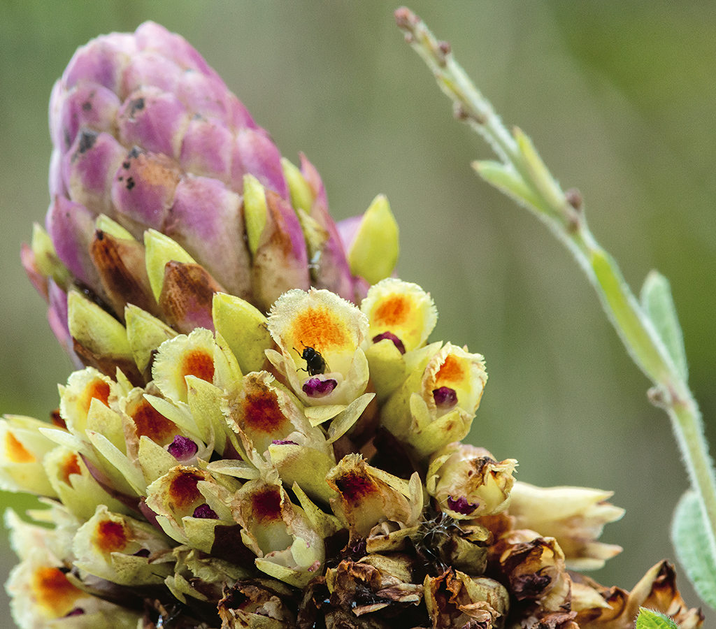 Las diminutas flores de muchas orquídeas son visitadas por dípteros pequeños que actúan como mediadores en la polinización. En la foto, ­Cranichis antioquiensis.