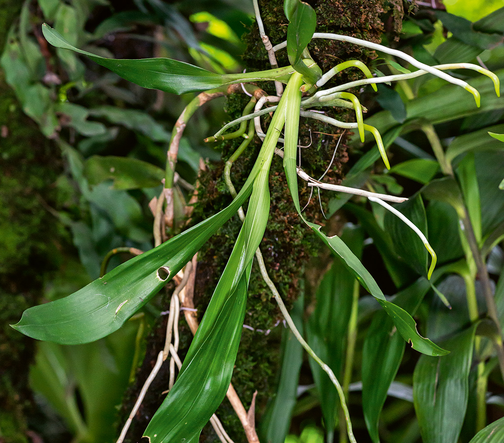 En su lucha por la supervivencia aérea, las orquídeas han desarrollado otras estrategias notables. Suelen crecer acompañadas de musgos, líquenes y otras epífitas que ayudan a mantener la humedad alrededor de sus raíces. En bosques estacionalmente secos, muchas desarrollan pseudobulbos y hojas suculentas recubiertas de ceras protectoras, y en ambientes más húmedos, sus raíces provistas de velamen absorben la humedad del aire y capturan las gotas de neblina; curiosamente, las puntas de estas raíces aéreas contienen cloroplastos funcionales, por lo que adquieren un tono verde que revela su capacidad para realizar fotosíntesis. Desde los rincones más iluminados hasta los más umbríos del dosel forestal, cada detalle anatómico de estas plantas refleja una perfecta sintonía con su entorno particular.