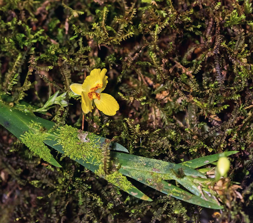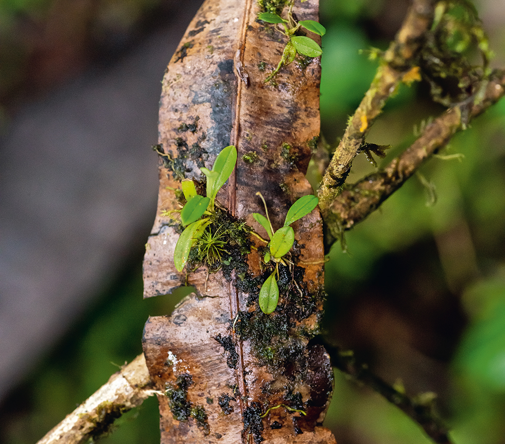 Para que la conservación de las orquídeas sea posible es necesario reconocerlas como parte de una red ecológica. En la foto, plántulas sobre una hoja en descomposición.