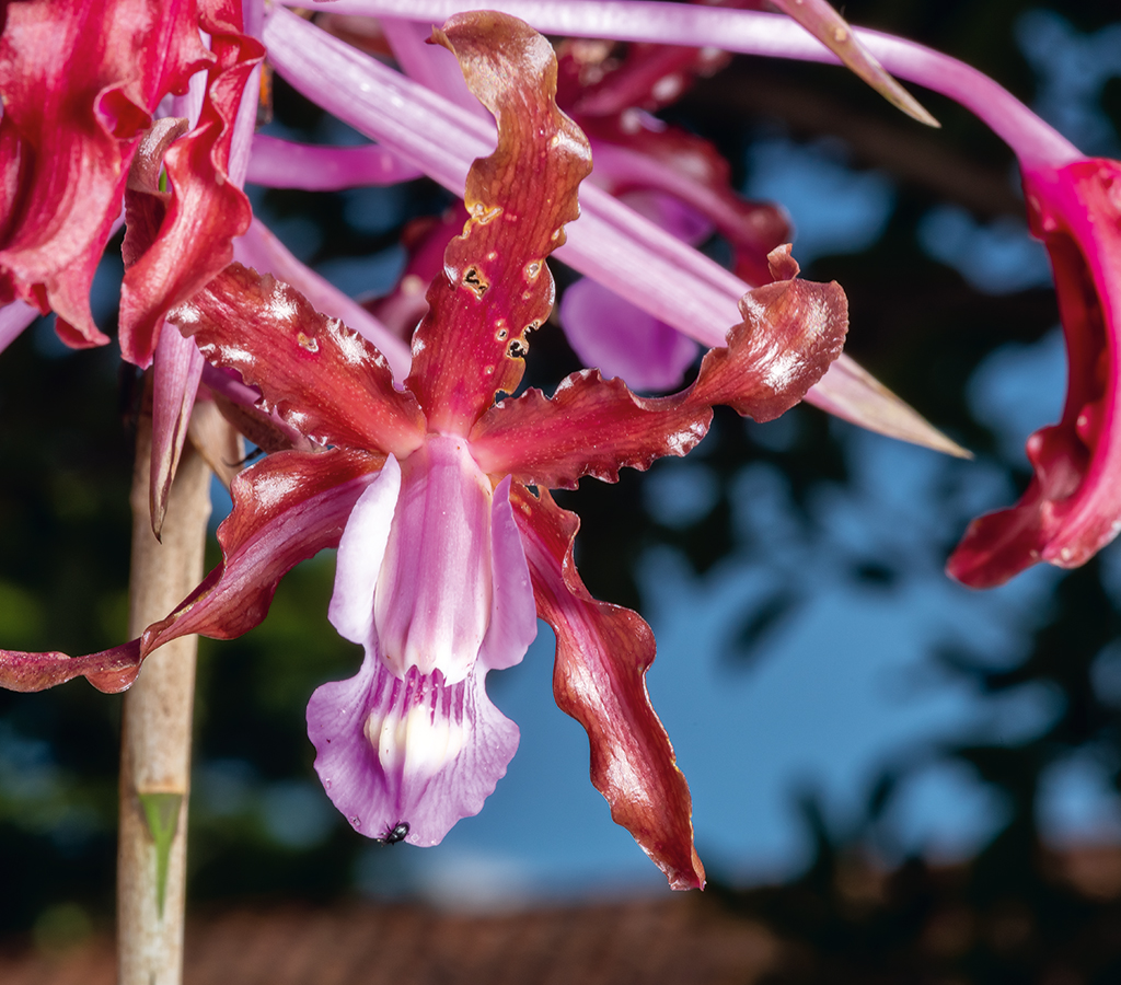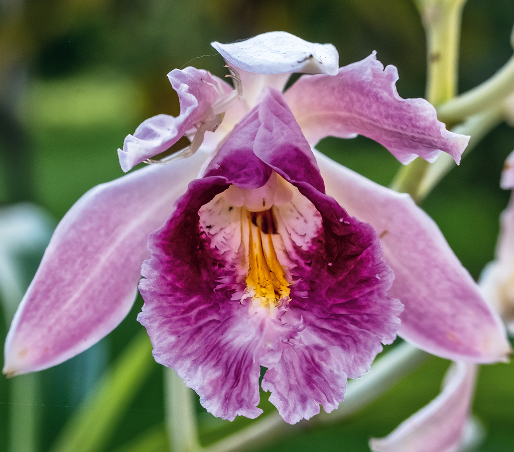 Es necesario proteger integralmente los ecosistemas que albergan a todos los organismos que interactúan con las orquídeas. En la foto, Sobralia roezlii es visitada por una araña cangrejo (Misumena sp.), semioculta bajo el pétalo superior izquierdo.