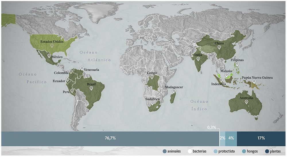 Los países de las zonas tropicales y subtropicales son los que cuentan con los mayores tesoros naturales, aunque también algunos de la zona templada, como China y Estados Unidos, debido a la gran extensión de sus territorios, poseen una biodiversidad significativa. Como un mecanismo de consulta y cooperación para promover las prioridades de preservación y uso sostenible de la diversidad biológica, el Convenio sobre la Diversidad Biológica —ratificado por 193 países, mediante la Declaración de Cancún— creó en 2002 el Grupo de Países Megadiversos, del cual actualmente forman parte 17 naciones, incluida Colombia. En cada uno de sus territorios habita por lo menos una de cada 10 especies vivientes; en otras palabras, poseen por lo menos un 10 % de la biodiversidad mundial. Se estima que estas naciones albergan conjuntamente casi el 70 % de todas las especies existentes en el mundo.