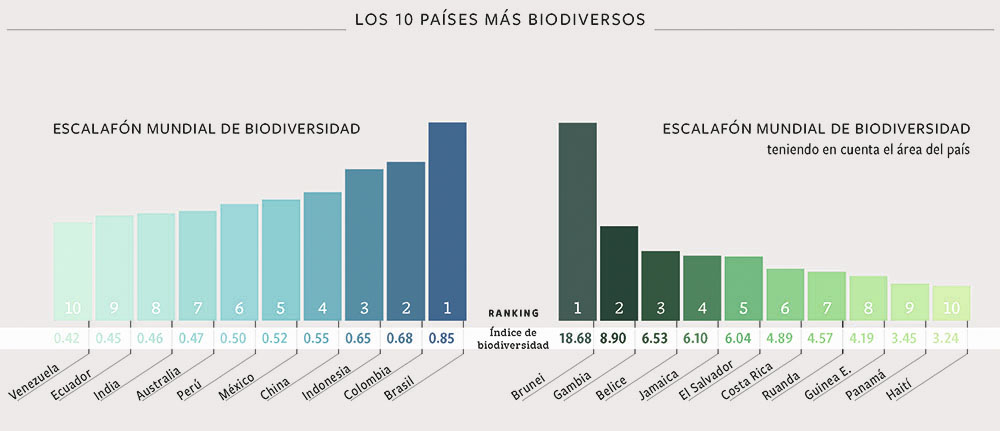 Dado que la cantidad total de especies en un país depende en buena parte de la superficie que este ocupa, el Escalafón tiende a privilegiar a los de mayor tamaño como Brasil, China y Estados Unidos. Pero si el índice de biodiversidad se calcula en relación con su área, algunos países muy pequeños ostentarían los primeros lugares: Brunei, Gambia, Belice, Jamaica, El Salvador y Costa Rica encabezarían la lista. En este caso, nuestro país ocuparía un modesto lugar en la casilla 51 y Brasil, el indiscutido campeón de la biodiversidad terrestre, estaría apenas en la posición 146.