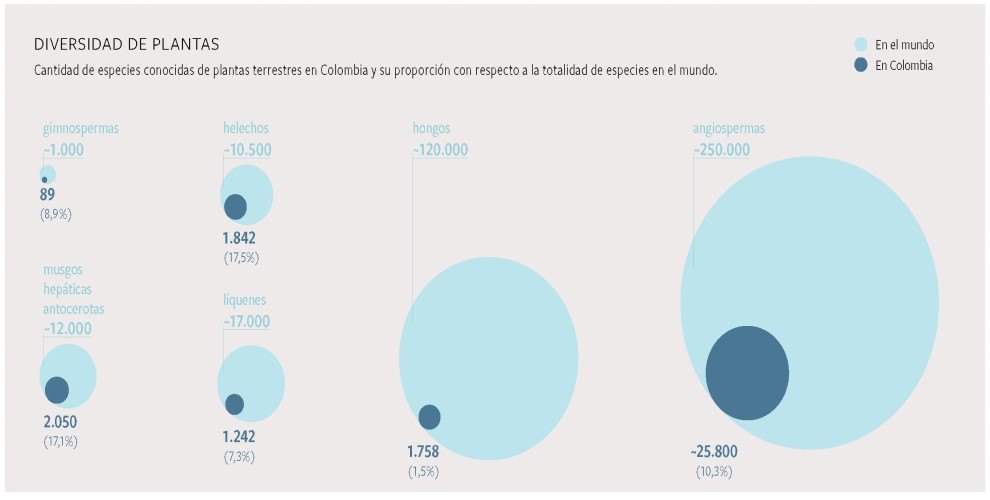 Con alrededor de 30.000 especies registradas, no resulta extraño que Colombia sea, después de Brasil, el segundo país con mayor diversidad florística del mundo; a esa cantidad, el grupo de las angiospermas —plantas que producen flores— aporta cerca de 26.000 especies, entre las que se destacan por su diversidad las familias Orchidaceae, Rubiaceae y Asteraceae. Es de suma importancia destacar que la riqueza de la flora colombiana, en lo que respecta a las 12 familias con mayor cantidad de especies en el mundo, representa cerca del 13 % del total.