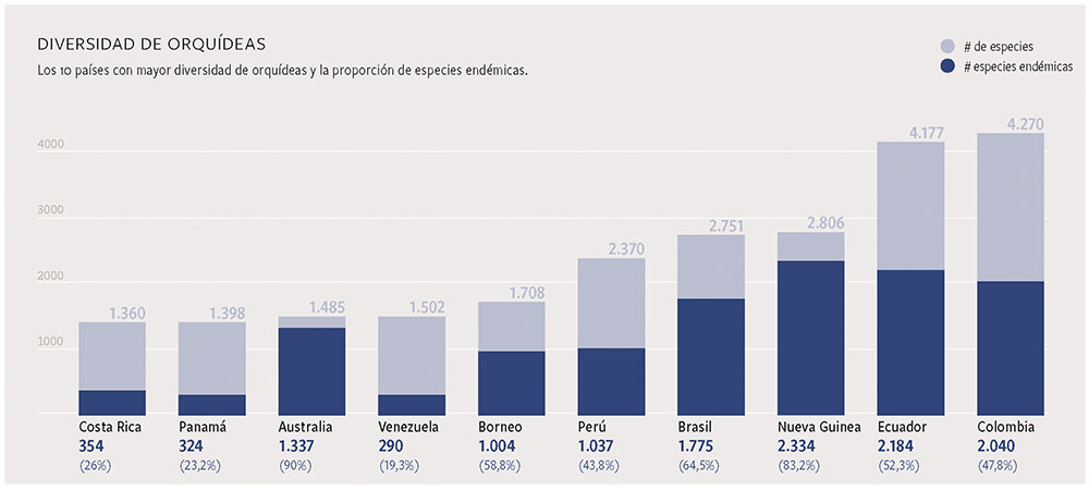 Colombia ostenta sobradamente el primer lugar en riqueza de orquídeas en el mundo, con un total de 4.270 especies registradas, agrupadas en 274 géneros. Los géneros con más especies en Colombia son Epidendrum, Lepanthes, Stelis y Pleurothallis. La emblemática Cattleya trianae fue declarada en 1936 como la flor nacional de Colombia por la Academia Colombiana de Historia.