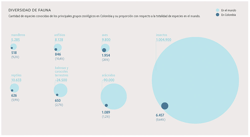 El territorio colombiano representa un heterogéneo mosaico de 86 tipos de ecosistemas generales y cerca de 8.000 ecosistemas específicos, los cuales albergan, en conjunto, no menos de 30.000 especies de plantas, cantidad superada únicamente por Brasil, cuyo territorio es 7,5 veces mayor. Por lo tanto, tal diversidad ecosistémica y de especies de plantas se ve reflejada en una extraordinaria variedad de animales. En efecto, Colombia ocupa el primer lugar en el mundo en riqueza de especies de aves, el segundo en mariposas, peces de agua dulce y anfibios y el sexto en reptiles y mamíferos. Hasta ahora han sido registradas en Colombia unas 14.000 especies de animales exclusivamente terrestres, pero dicha cifra es susceptible de crecer muy significativamente a medida que aumenten las colectas en campo y las investigaciones zoológicas en nuestro territorio.