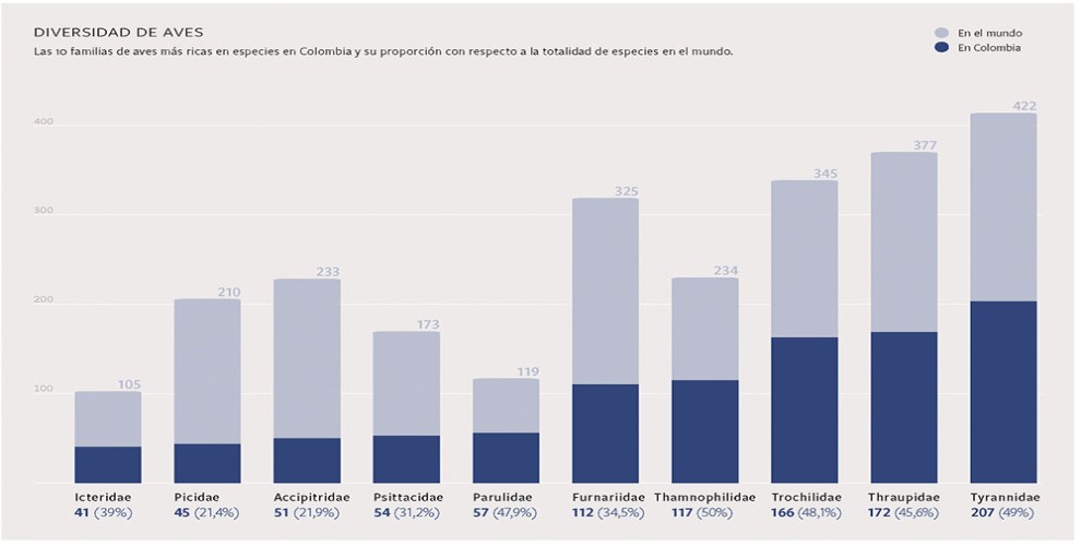 Al igual que en la mayoría de países de América, excepto Canadá y Estados Unidos, la familia de aves más diversa en Colombia es la Tyrannidae o de los atrapamoscas, con 207 especies de las 422 conocidas en el mundo, seguida por la Thraupidae o de las tángaras, con 172 de las 377 existentes, y la Trochilidae o de los colibríes, con 166. Se estima que el 41 % de las aves presentes en el país se encuentra en la región Andina y un porcentaje similar en la Amazonia, mientras que el 37 % habita en la región Caribe, el 34 % en la región Pacífica y el 25 % en la Orinoquia. Se debe tener en cuenta que varias especies se encuentran en dos o más regiones, razón por la cual la suma de los porcentajes mencionados es mayor a 100.