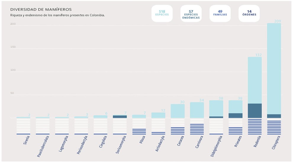 Un total de 518 especies registradas hasta ahora, sitúan a Colombia como el sexto país del mundo en riqueza de mamíferos y el cuarto en América después de Brasil. Dicha cifra no incluye las dos especies de roedores —la rata y el conejo doméstico— y el hipopótamo, que fueron introducidas al país de manera accidental o intencional y viven actualmente de forma libre en el medio natural, asilvestradas. Si se descuentan las 35 especies de mamíferos exclusivamente acuáticos —delfines, ballenas, cachalotes, manatíes y lobos marinos—, las 483 especies nativas de mamíferos terrestres se distribuyen en 12 órdenes y 42 familias. De esas especies 57 son endémicas —31 roedores, 10 primates, 8 murciélagos, 5 musarañas y 3 zarigüeyas—. Los murciélagos —orden Chiroptera— y los roedores —orden Rodentia—, con 209 y 132 especies respectivamente, acaparan casi el 65 % de la riqueza de mamíferos en Colombia. En contraste, los sirénidos o manatíes —orden Sirenia— y los lagomorfos o conejos —orden Lagomorpha— están representados solamente por dos especies cada uno.