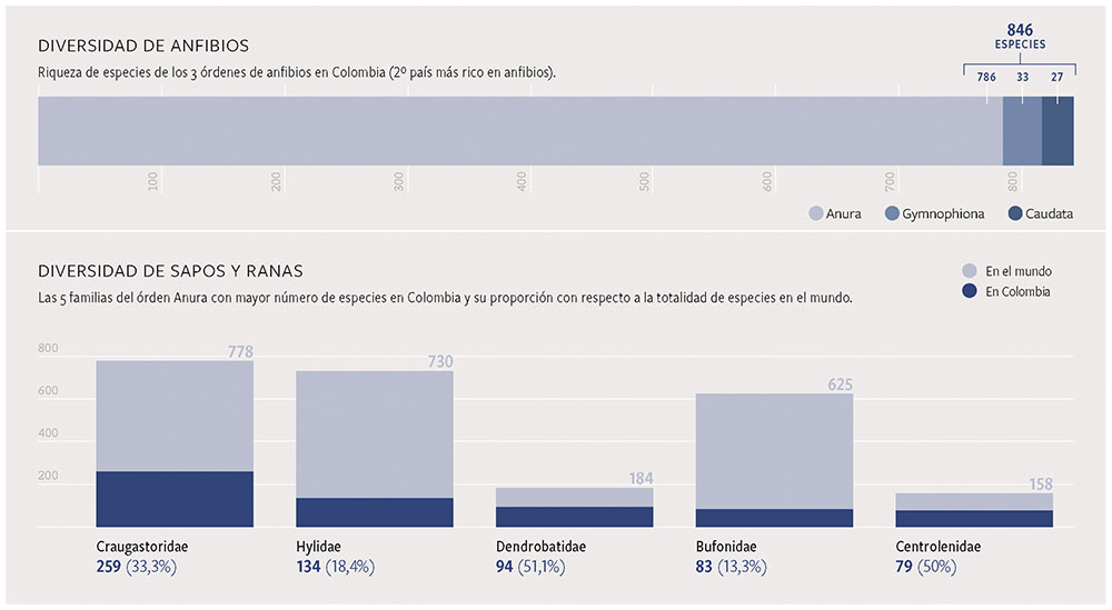 Con 846 especies —786 de ranas y sapos, 27 de salamandras y 33 de cecilias o serpientes ciegas—, Colombia es, después de Brasil, el segundo país más rico en anfibios. Unas 320 especies son endémicas del país. De nuevo, es en la región Andina donde se concentra la mayor cantidad de especies, con cerca del 73 %, seguida de lejos por el Chocó biogeográfico y la Amazonia, que albergan, cada una, alrededor del 20 %. Las ranas cutín o de hojarasca —familia Craugastoridae— conforman el grupo más diverso de anfibios en Colombia, con 259 especies de las 778 conocidas en el mundo, la mayoría de ellas endémicas. Su reproducción no requiere de cuerpos de agua, lo cual les ha permitido ocupar una amplia variedad de ambientes, incluyendo bosques secos y páramos.
