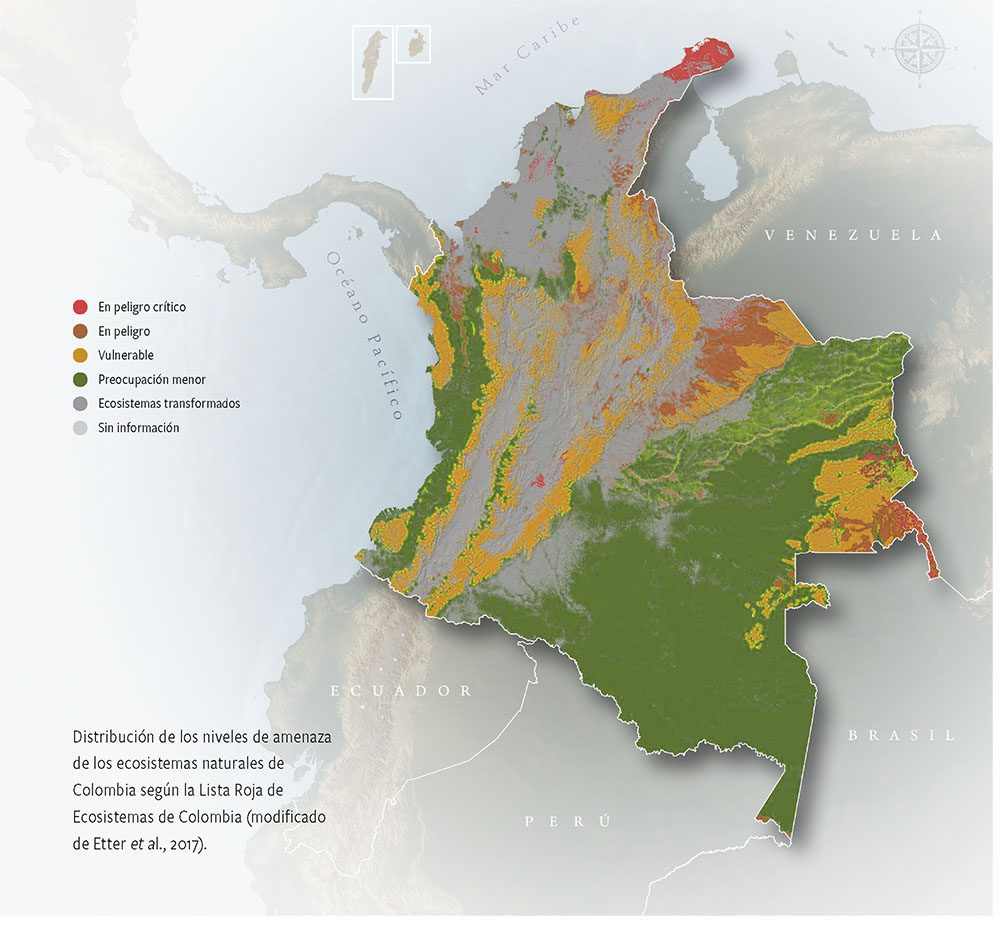 Según la Lista Roja de Ecosistemas de Colombia, el 46 % de los ecosistemas terrestres se encuentra altamente amenazado —categorizados como En peligro o En peligro crítico—. Estos ecosistemas abarcan en total un 10 % de la extensión del territorio emergido del país y se concentran principalmente en las planicies del Caribe y de la Orinoquia. Otro 26 % de los ecosistemas, que ocupan el otro 22 % del territorio nacional, se encuentran en estado Vulnerable.