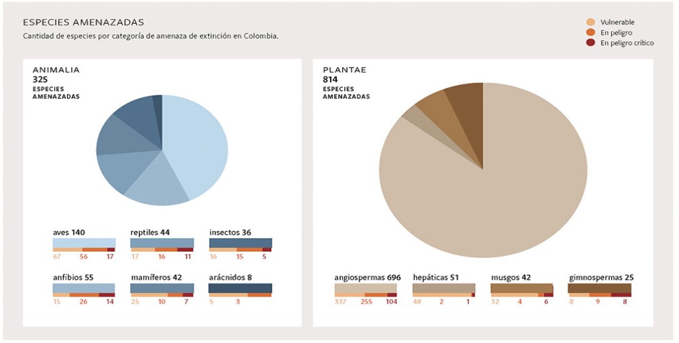 La diversidad de ecosistemas se ve reflejada en la gran cantidad de seres vivos que habita en ellos. Por lo tanto, la intervención humana en los ecosistemas ha puesto en riesgo la supervivencia de buena parte de la fauna y la flora nativas del país. Actualmente, a pesar de que no ha sido evaluado el estado de conservación de más del 6 % de las 53.000 especies registradas en el país, 1.139 de ellas —814 plantas y 325 animales— se encuentran bajo algún nivel de amenaza de extinción, en los Libros Rojos de Especies Amenazadas de Colombia.