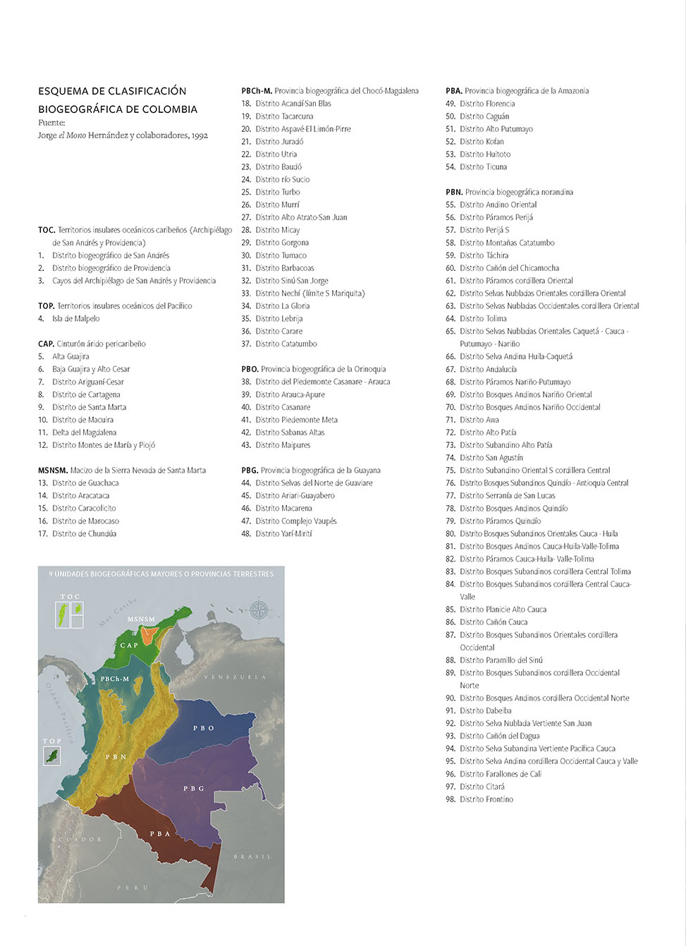 El esquema de clasificación biogeográfica de Colombia mejor ajustado a lo que se conoce de la realidad climática, topográfica, ecosistémica y biológica del país, fue propuesto por el insigne naturalista colombiano Jorge el Mono Hernández y colaboradores en 1992 y, pese a su antigüedad, no difiere sustancialmente de otros esquemas propuestos en años más recientes. El esquema también identifica tentativamente un total de 98 unidades biogeográficas menores o distritos biogeográficos en el interior de las nueve provincias, lo cual refleja la complejidad y diversidad de la biota en el territorio colombiano. Sobresalen los 43 distritos pertenecientes a la Provincia Norandina, lo que corrobora la extraordinaria exuberancia de la biodiversidad de los Andes tropicales.