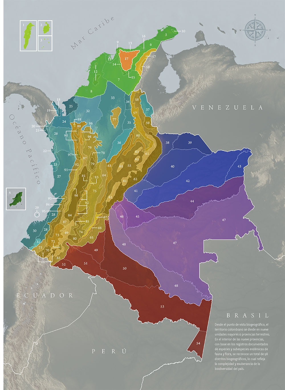 La localización latitudinal del país entre ambos hemisferios, la variedad de los relieves, de las condiciones climáticas y de suelos, y la amalgama de acontecimientos históricos que permitieron la dispersión, el intercambio y la diversificación de la biota, configuraron un intrincado mosaico biogeográfico en el territorio colombiano. Dicho mosaico encuentra su expresión espacial en la existencia de nueve unidades biogeográficas mayores o provincias biogeográficas terrestres, que pueden delimitarse de forma más o menos precisa, de acuerdo con los registros de diferentes especies y subespecies de fauna y flora, los cuales permiten deducir sus áreas y tendencias de distribución geográfica.