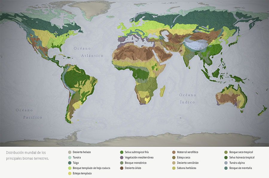 Al observar nuestro planeta es posible distinguir sobre los continentes una serie de franjas con tonalidades de verde, marrón y amarillo, de anchura variable, que discurren de manera más o menos paralela al ecuador y que tienden a repetirse con la misma disposición en todos los continentes. Cada una de esas franjas corresponde a una zona en la que las características del clima —valores promedio y estacionalidad anual de temperatura y pluviosidad— son prácticamente iguales o no difieren significativamente entre un lugar y otro. Esto se traduce en una gran homogeneidad en la apariencia de la vegetación y en una similitud de las formas de vida de los organismos que habitan en una misma franja, con pocas diferencias entre un continente y otro. Estas zonas, con características climáticas y fisionomía de la vegetación homogéneas, se denominan biomas y constituyen la unidad espacial básica empleada en ecología para caracterizar los patrones de la biodiversidad. A nivel global se reconocen entre 16 y 18 biomas terrestres clasificados según la vegetación, entre los cuales se destacan por su extensión los bosques templados cuyos árboles pierden las hojas en otoño —caducifolios—, la selva húmeda tropical, la sabana, la tundra, la taiga y los desiertos. Cada bioma está compuesto por unidades más pequeñas o ecosistemas similares.