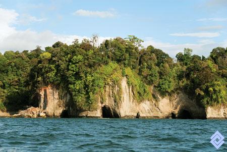 La actividad erosiva del oleaje moldea los acantilados de rocas sedimentarias en la bahÃa de Málaga, costa del PacÃfico.
