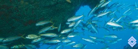 Cardumen de peces roncos y salmonetes en el mar Caribe.
