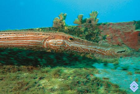 El pez trompeta que habitualmente se coloca en posición vertical, para pasar inadvertido.