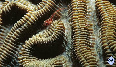 Un pez goby escondido dentro de un coral cerebro.