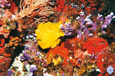 La forma que puede tomar el pez antenario o pez sapo para camuflarse, es la de una esponja y a la vez utiliza su antena para llamar la atención de su presa.