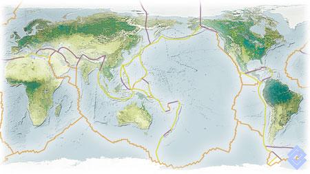 La corteza terrestre está compuesta por ocho grandes placas y 24 pequeñas, cuyos movimientos generan la transformación permanente del suelo oceánico y continental del planeta. En el diagrama se observan las dorsales oceánicas —fronteras divergentes—.
