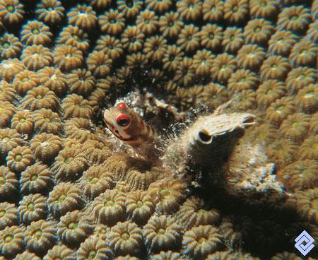El goby que tan solo alcanza uno a dos centímetros. Este vive generalmente dentro de los corales cerebro y cuerno de alce, o en los pequeños orificios de las esponjas.